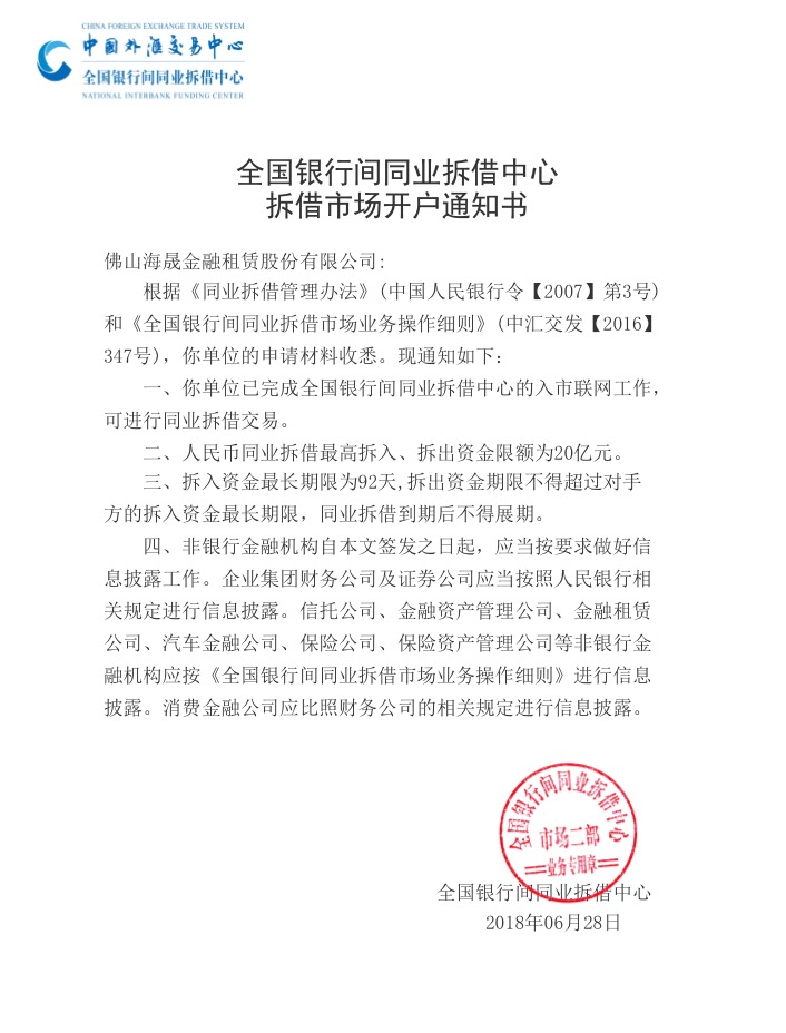 根据《同业拆借管理办法》,金融租赁公司在申请进入同业拆借市场前需最近两个年度连续盈利。自2016年6月成立以来,我司总体保持稳健向上的良好发展态势,流动性管理水平不断提高,成为全国银行间同业拆借市场成员,将进一步拓宽海晟金租的融资渠道,有效降低流动性风险。