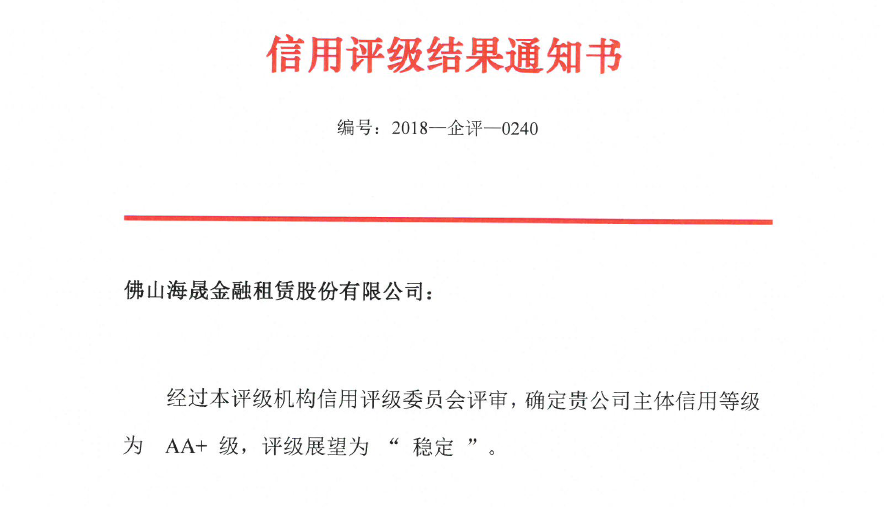 此次信用评级有效提升了海晟金租的品牌价值和市场认可度,同时,拓宽了在资本市场发展空间,为海晟金租今后发展打下了坚实的基础。