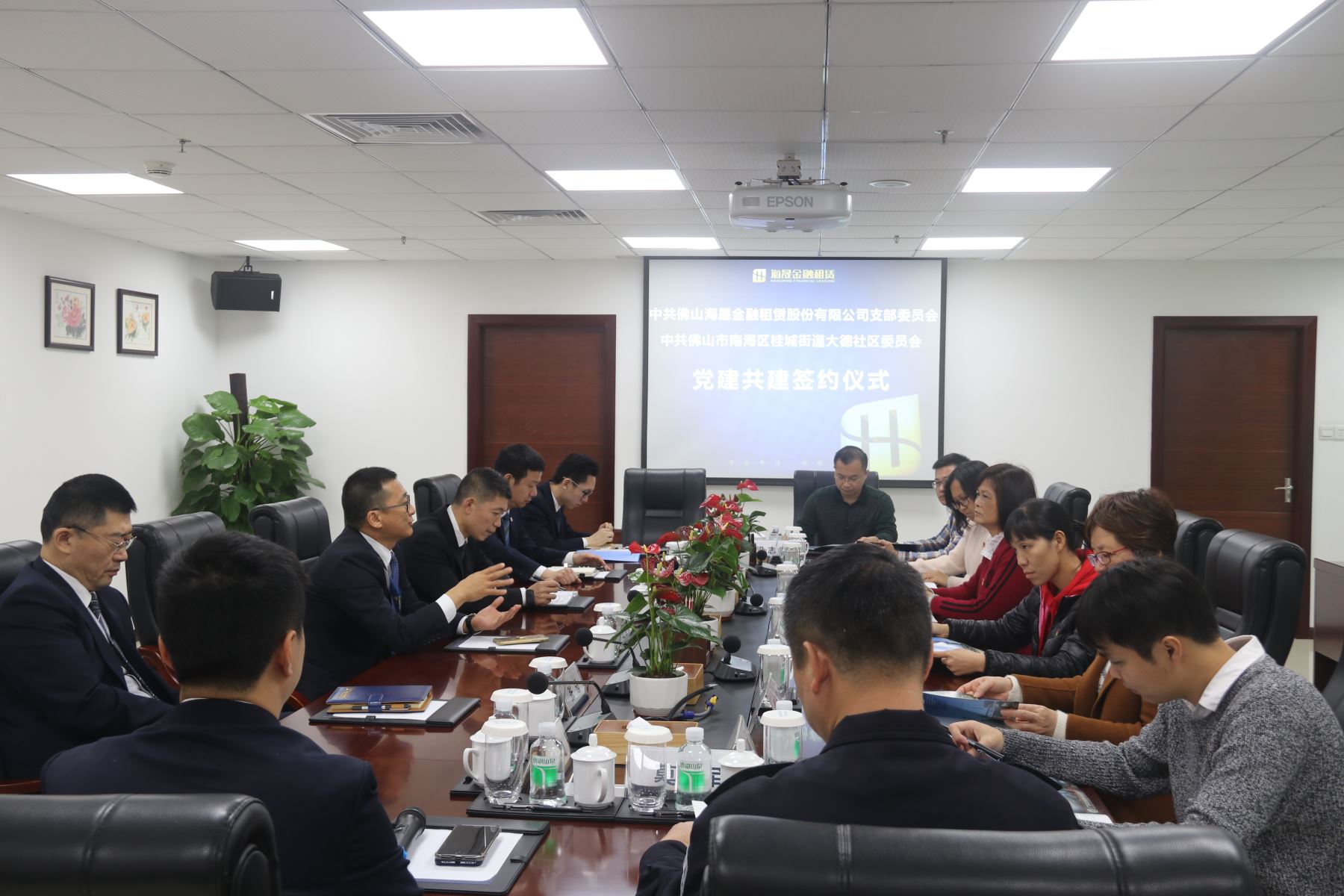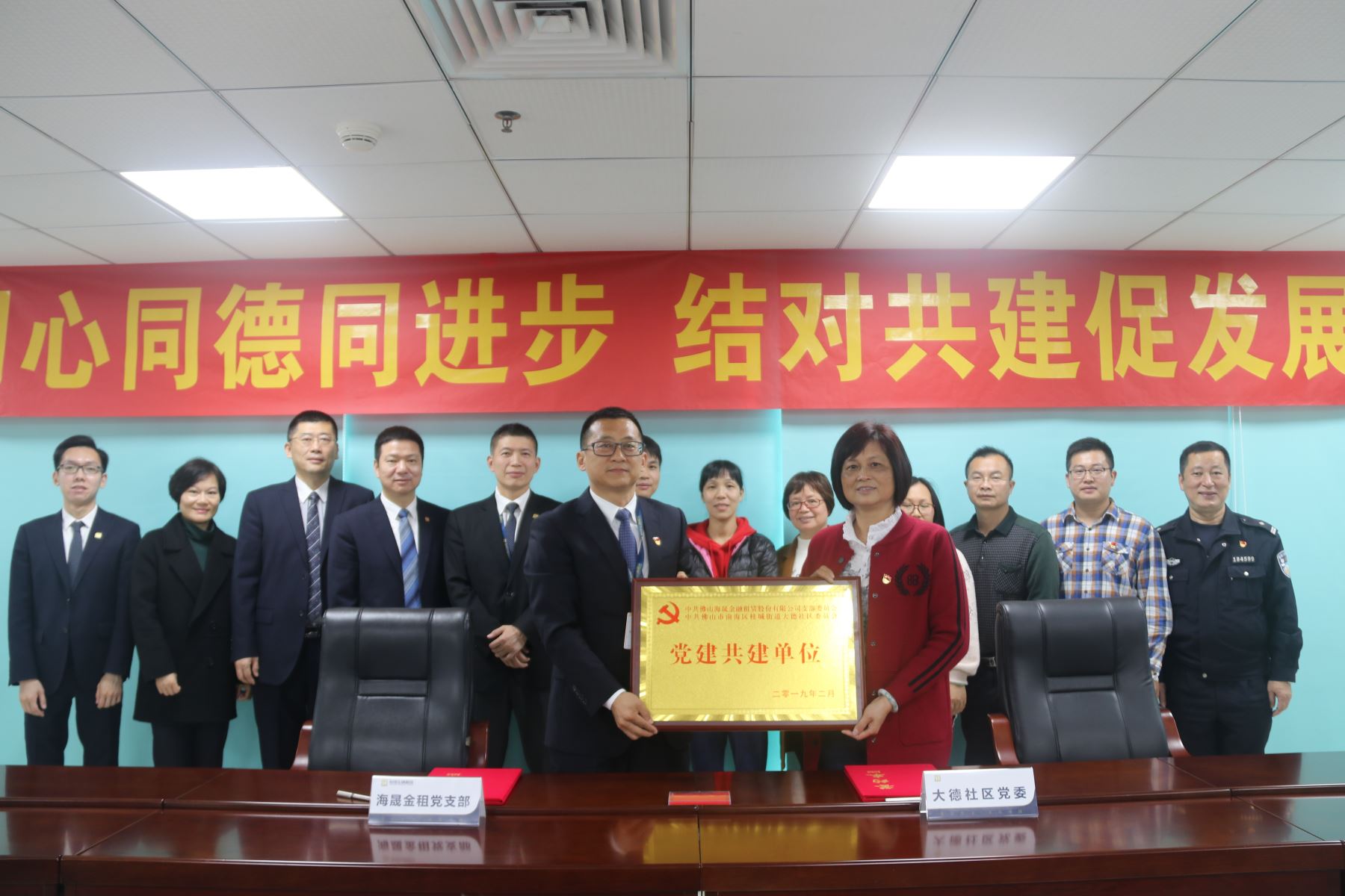同心同德同进步,结对共建促发展。为深入学习贯彻落实党的十九大精神和习近平总书记重要讲话精神,弘扬“支部建在连上”的光荣传统,推动全面从严治党向基层延伸,3月5日,中共古天乐代言太阳集团支部委员会(下称“海晟金租党支部”)与中共佛山市南海区桂城街道大德社区委员会(下称“大德社区党委”)举行“党建结对共建”签约仪式。