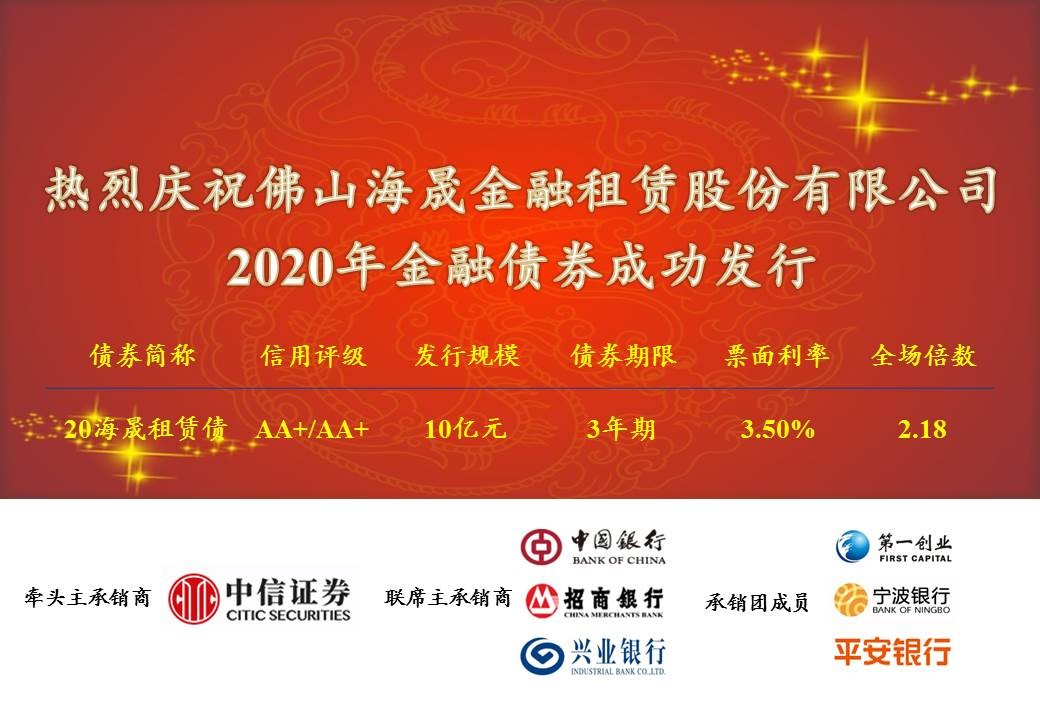 本次金融债券的成功发行是海晟金租的一个全新起点。公司将继续秉承“专业专注、成就卓越”的经营理念,深耕珠三角地区,为打造珠西高端装备制造产业带、为建设粤港澳大湾区提供高质量的金融租赁配套,做优做强整体规模水平,为成为“精品上市金融租赁公司”而奋斗。