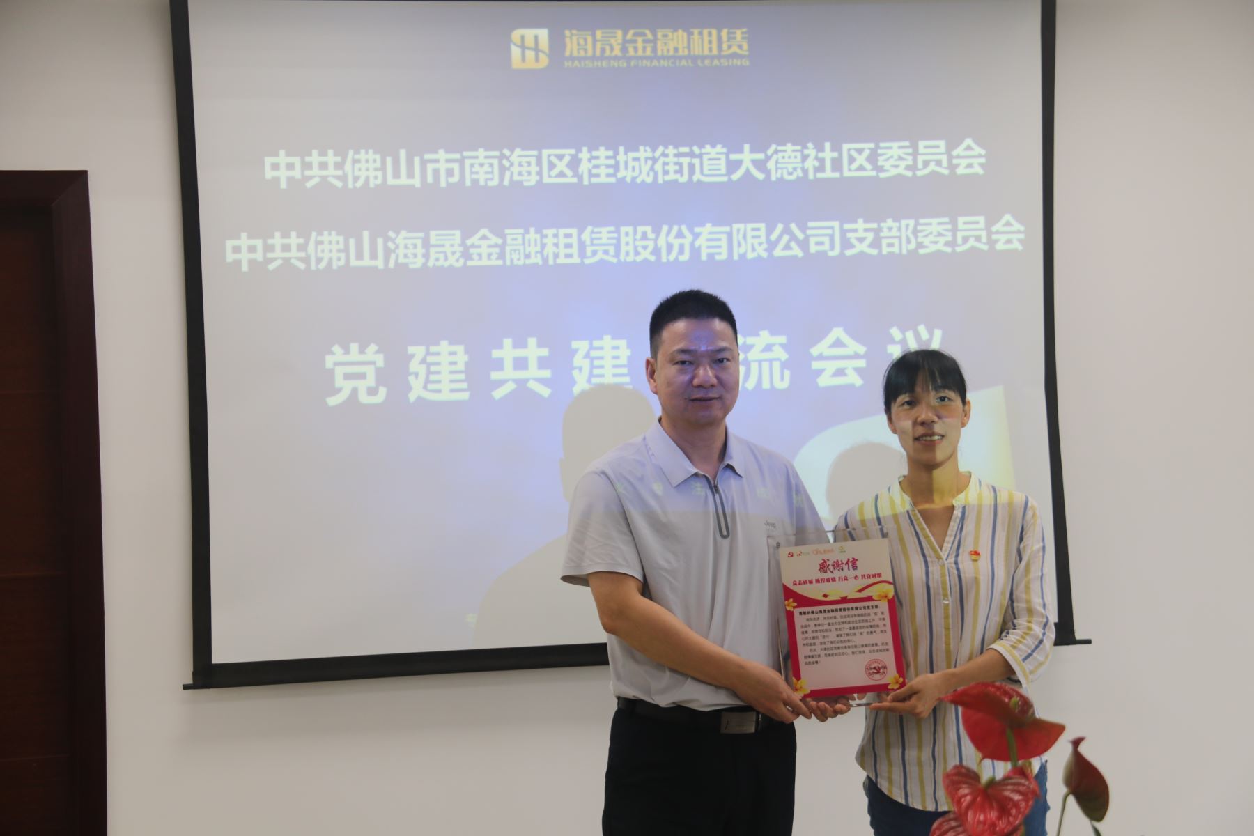 黎展涛书记代表大德社区党委向海晟金租党支部赠送感谢信