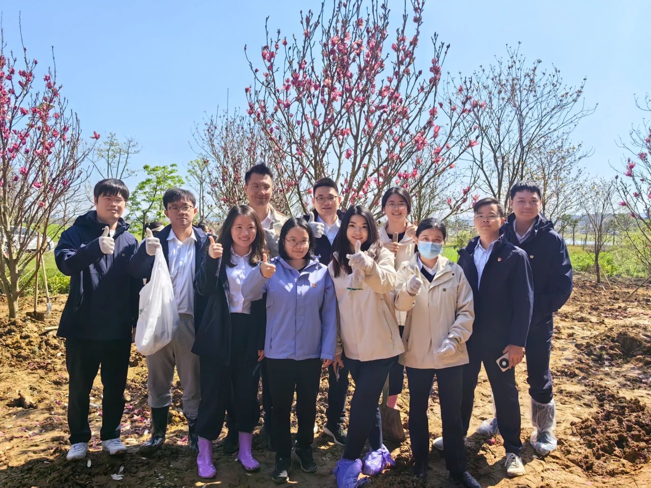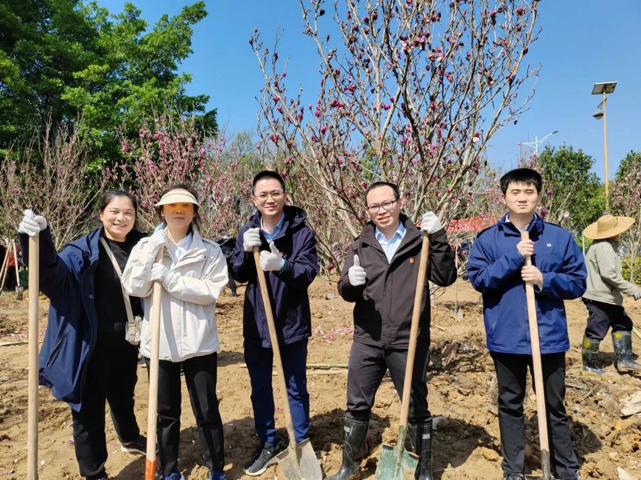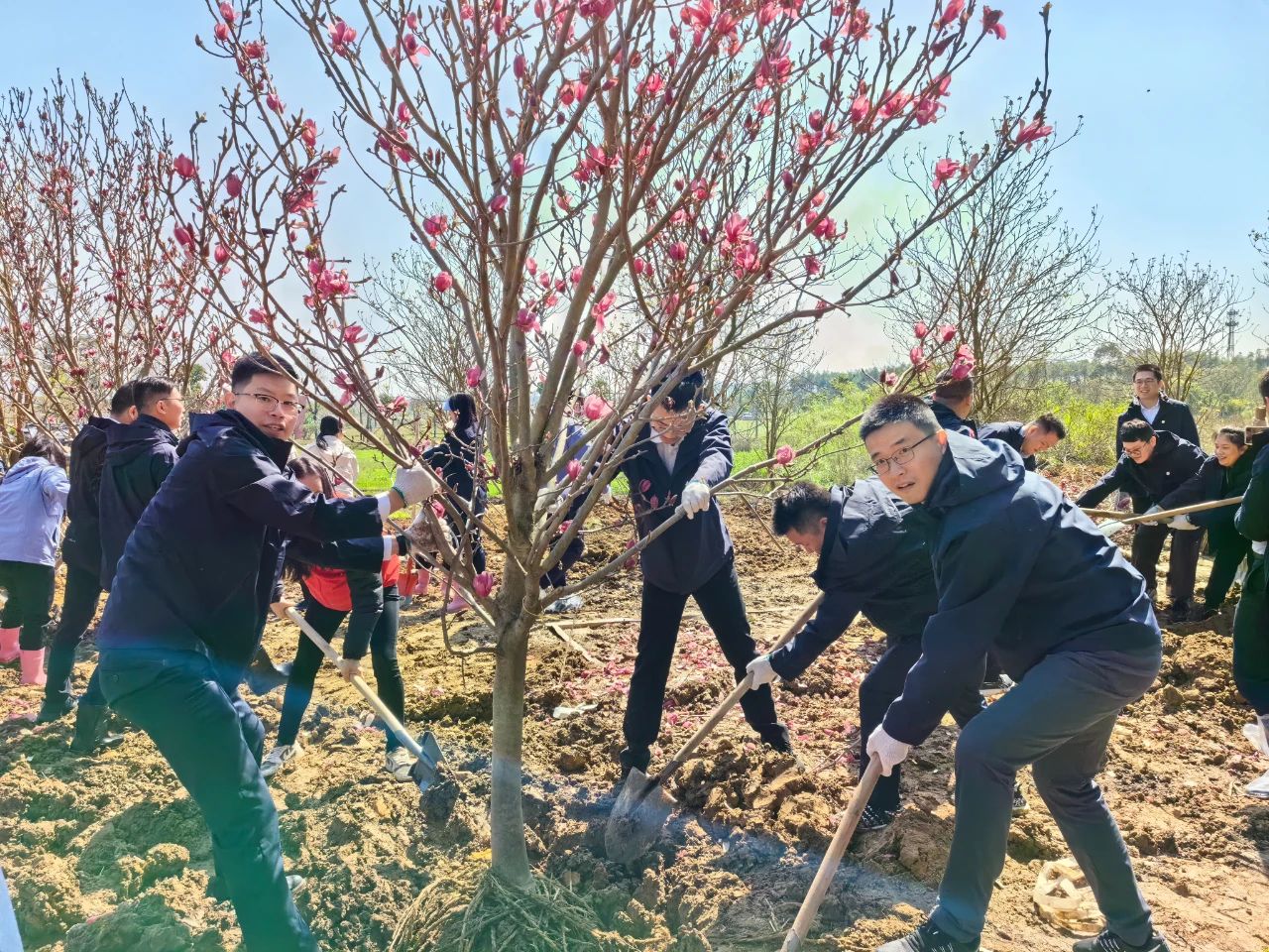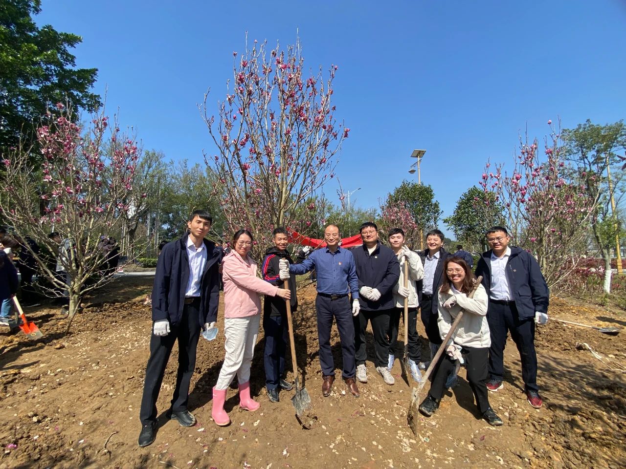 在简单的揭幕仪式后,活动正式进入植树环节。在明媚的春光下,海晟金租职工与乐平镇政府的党员同志们带头植树,众人三五成群,干得热火朝天。大家默契配合,挥锹铲土、扶正树苗、培土填坑,细心栽种了30棵黄花风铃木和玉堂春树苗。