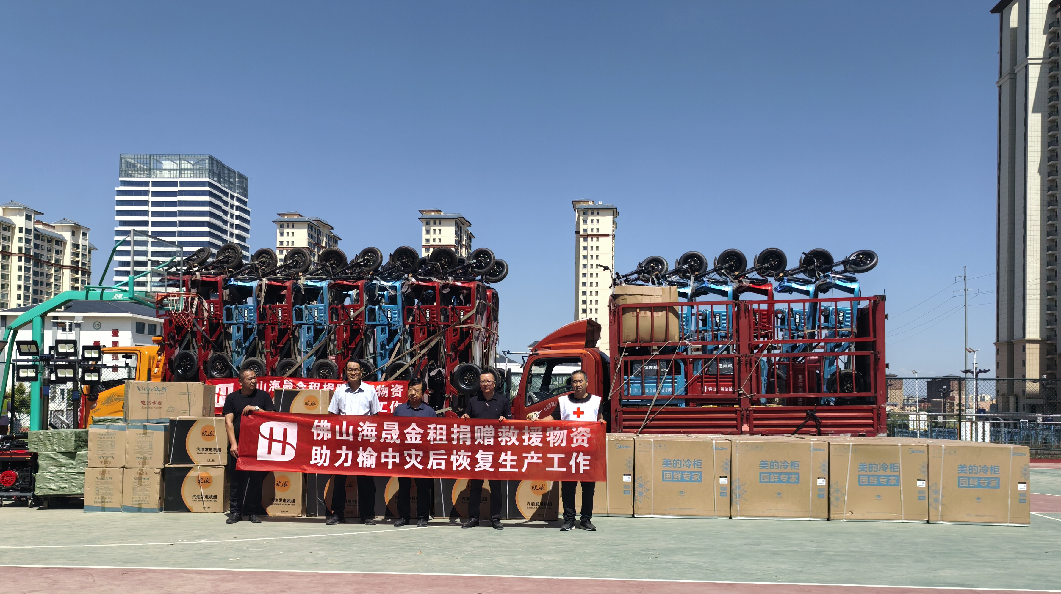 皇天不负有心人,在众人的努力下,在当地红十字会的见证下,佛山海晟金租采购的救灾重建应急物资,都及时运送到了榆中人民的手中。8月16日中午,5辆卡车缓缓驶入榆中县朝阳学校体育馆,卡车里满载的是总价值45万元的电动三轮车、应急发电机、强光手电、移动照明设备等急需物资,这些物资将在受灾地区后续的重建工作中发挥积极作用。