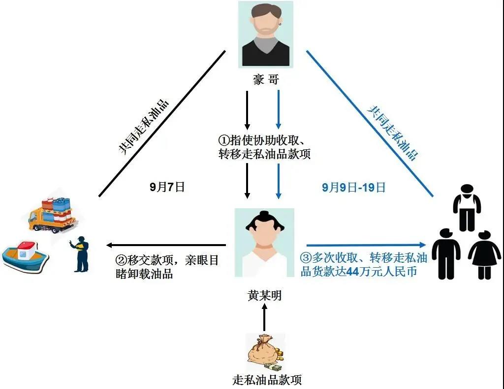 (一)提供个人银行账户并协助提现或转账转移资产。2020年9月7日晚,黄某明按照“豪哥”的指示,携带通过其名下银行账户收到的款项前往斗门区某桥西侧桥墩下,将款项交给停靠在该地的一艘船舶上的人员,并亲眼目睹现场人员从上述船舶上卸载油品的情景,知悉“豪哥”等人在走私油品。同年9月9日至19日,黄某明协助“豪哥”等人多次收取、转移走私油品货款,共计人民币439389元。