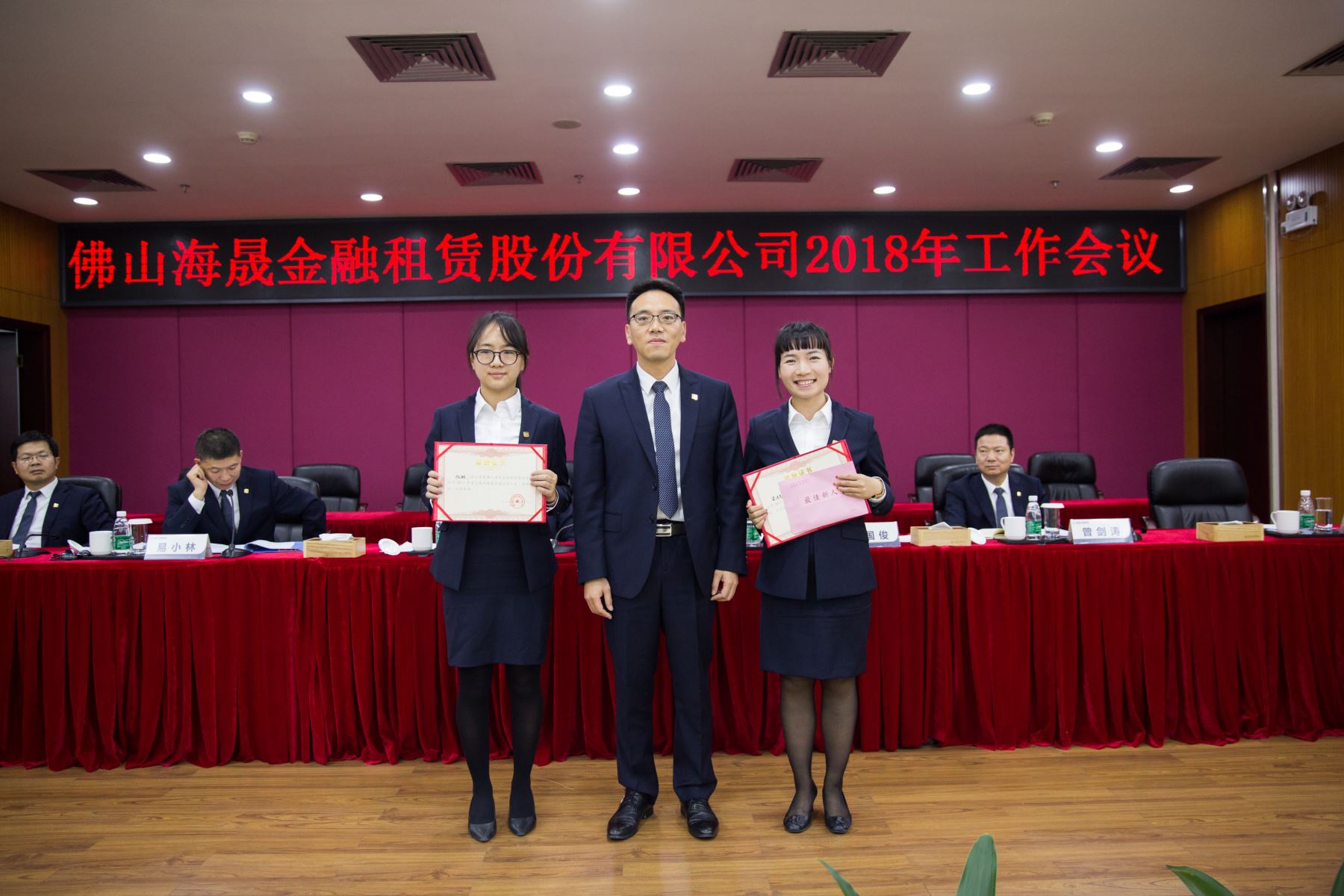 海晟金租副总裁李志聪先生为最佳新人奖获得者梁诗艺、何璐颁奖