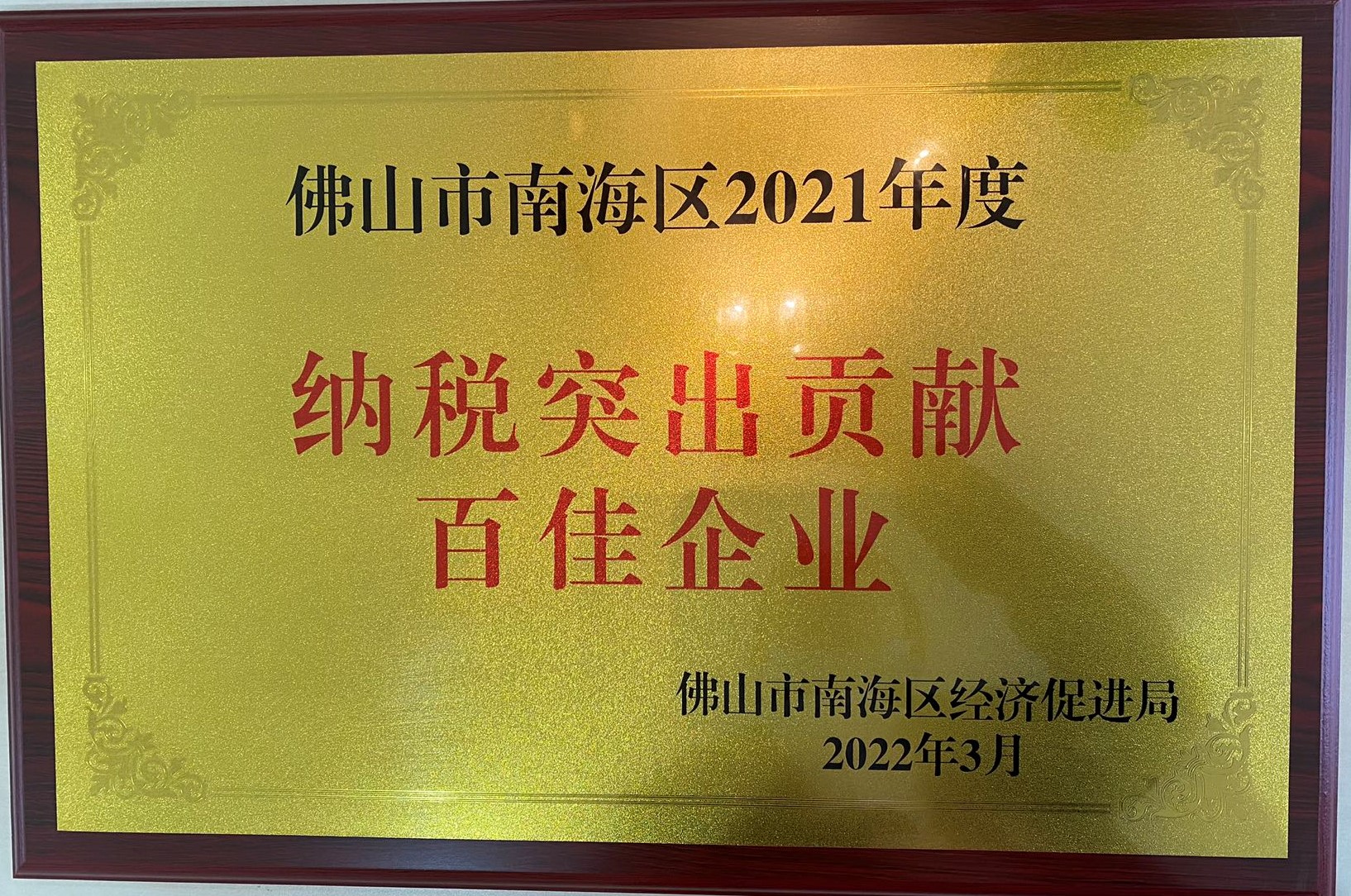 2022年3月 获得2021年度南海区“纳税突出贡献百佳企业”称号