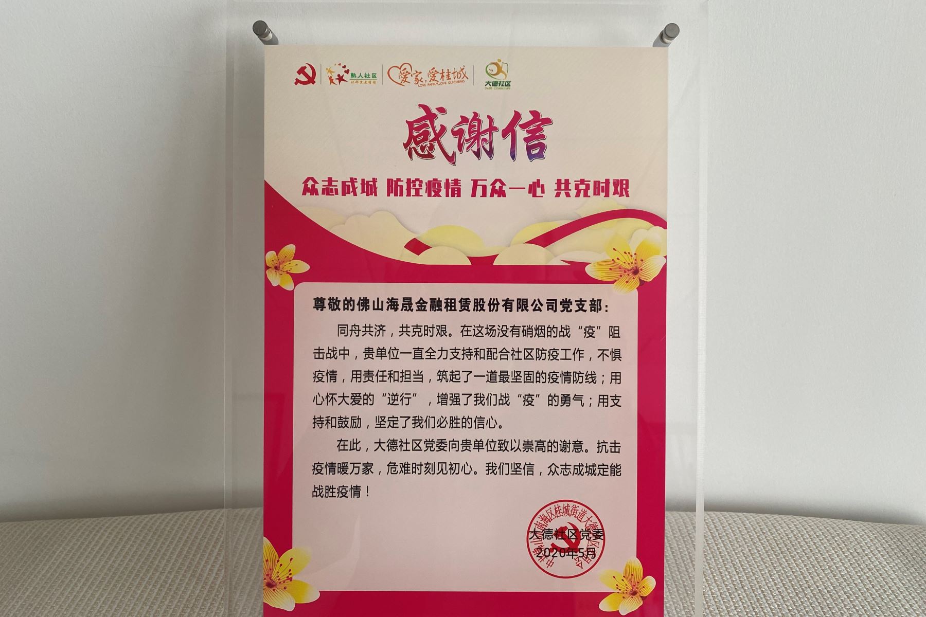 2020年 获得大德社区党委感谢信