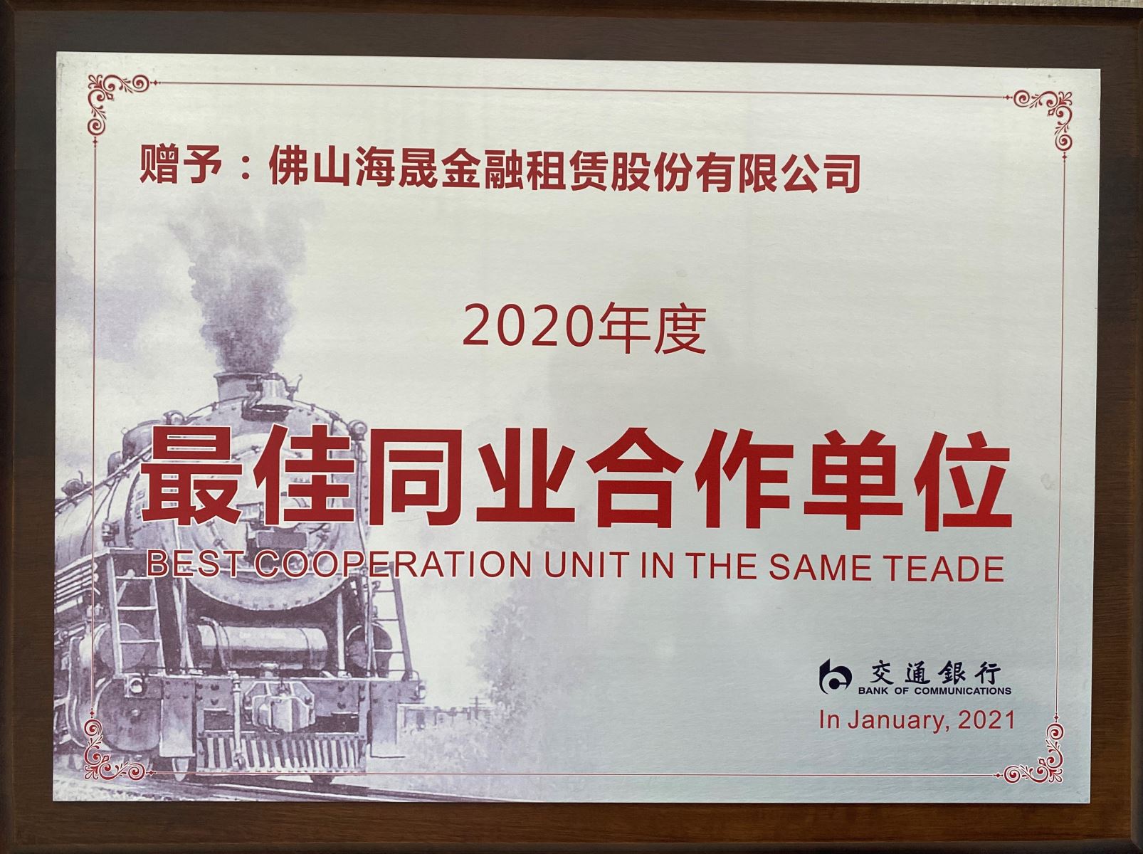 2021年1月 获得交通银行总行授予的全国性金融机构”最佳同业合作单位”荣誉称号
