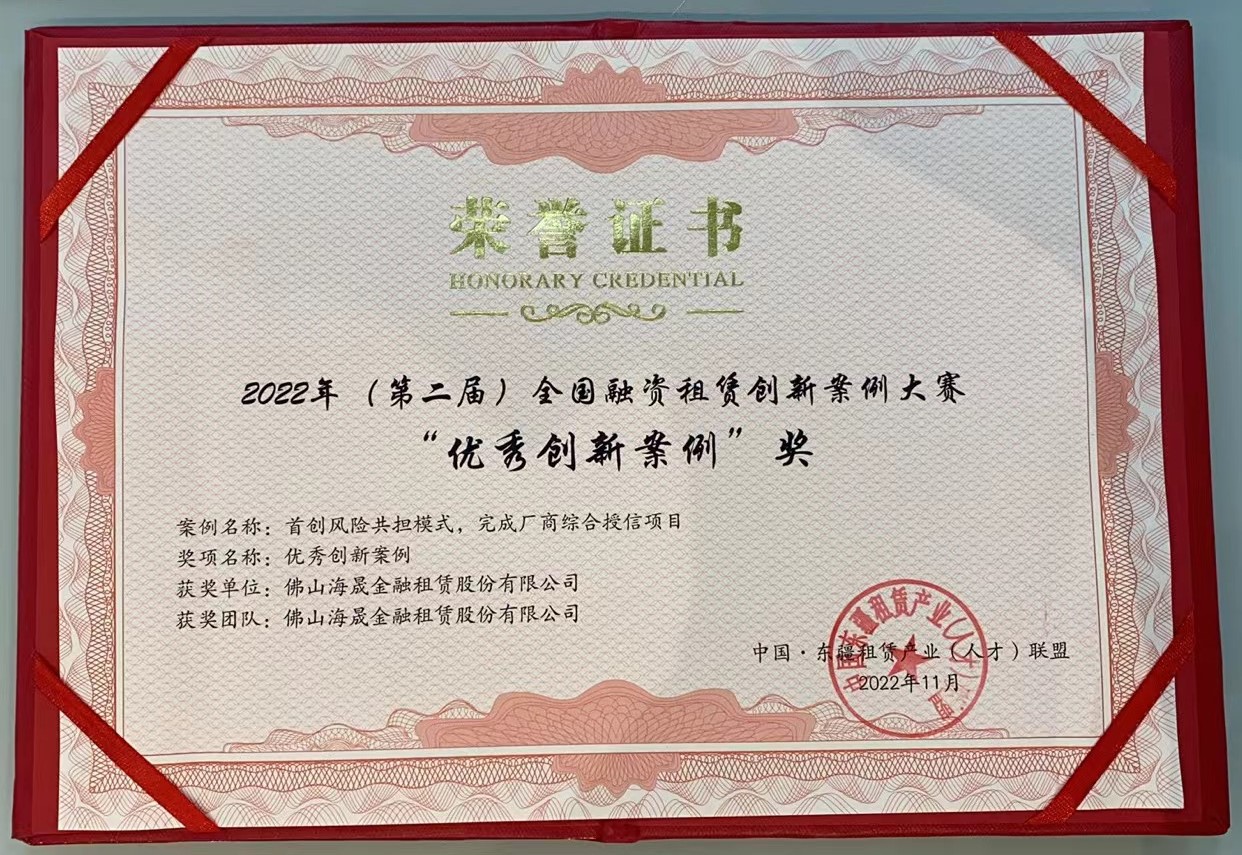 2022年11月 获得2022年(第二届)全国融资租赁创新案例大赛“优秀创新案例”奖