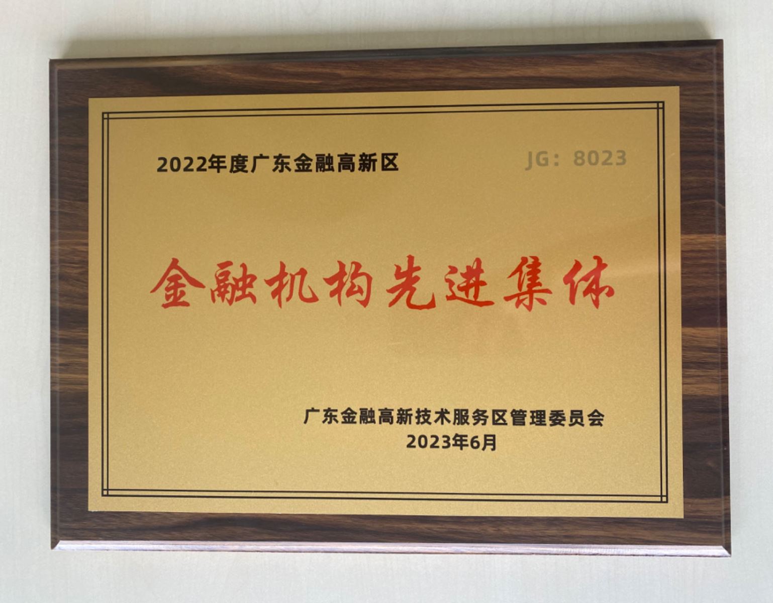 2023年6月 获得广东金融高新技术服务区管理委员会颁发的2022年度广东金融高新区金融机构先进集体奖
