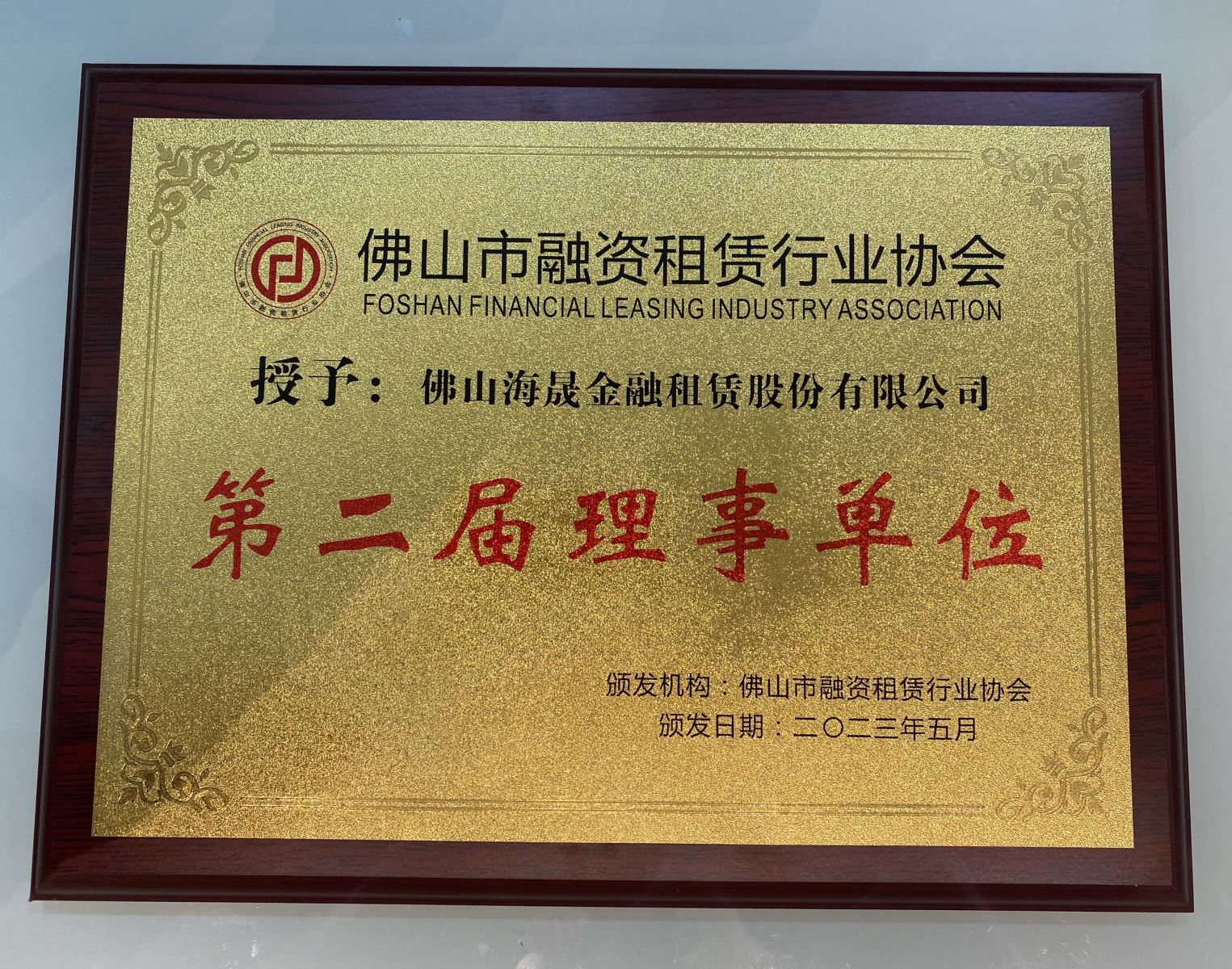 2023年5月 被佛山市融资租赁行业协会授予第二届理事会单位