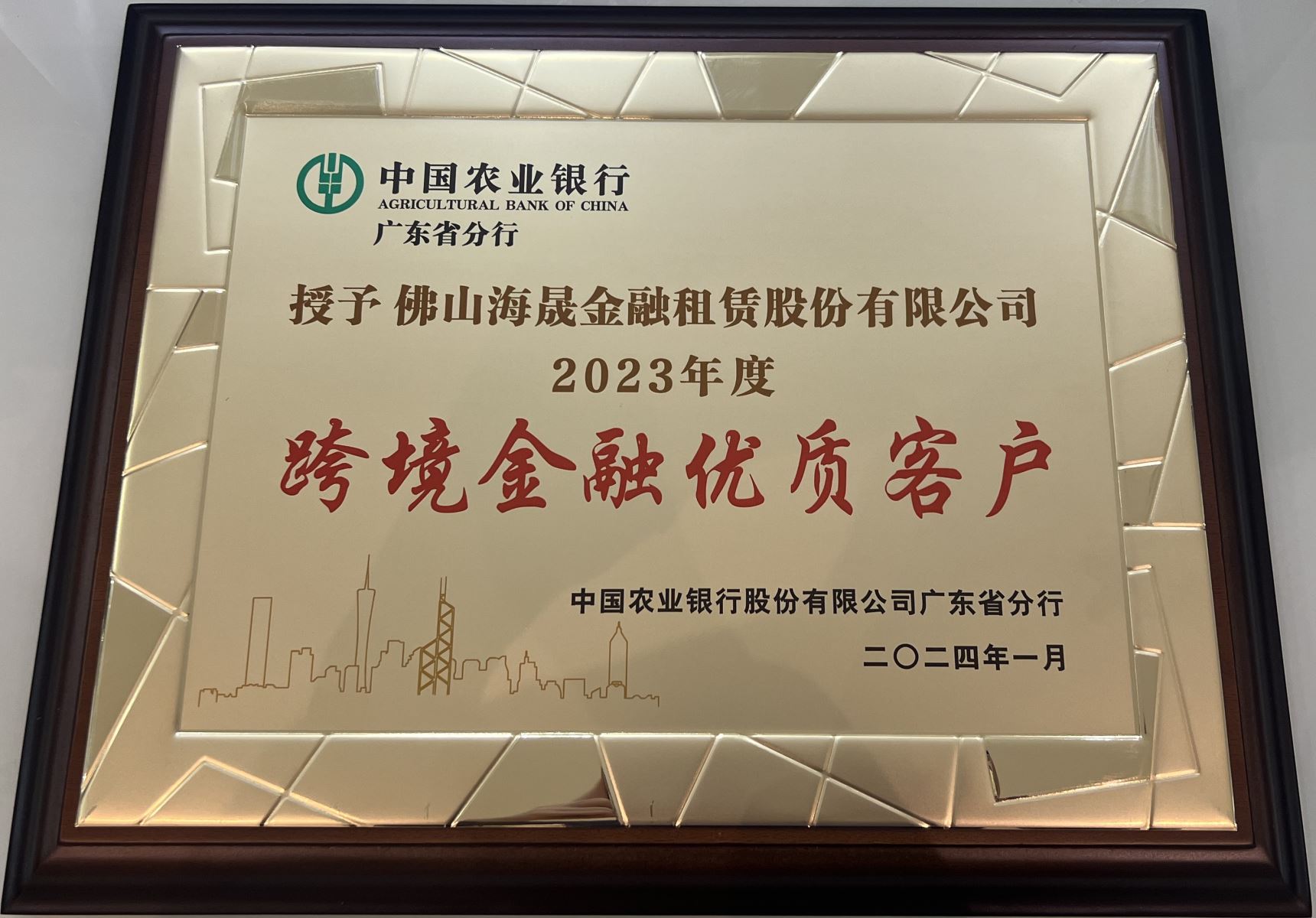 2024年1月 被中国农业银行股份有限公司广东省分行评为2023年度跨境金融优质客户