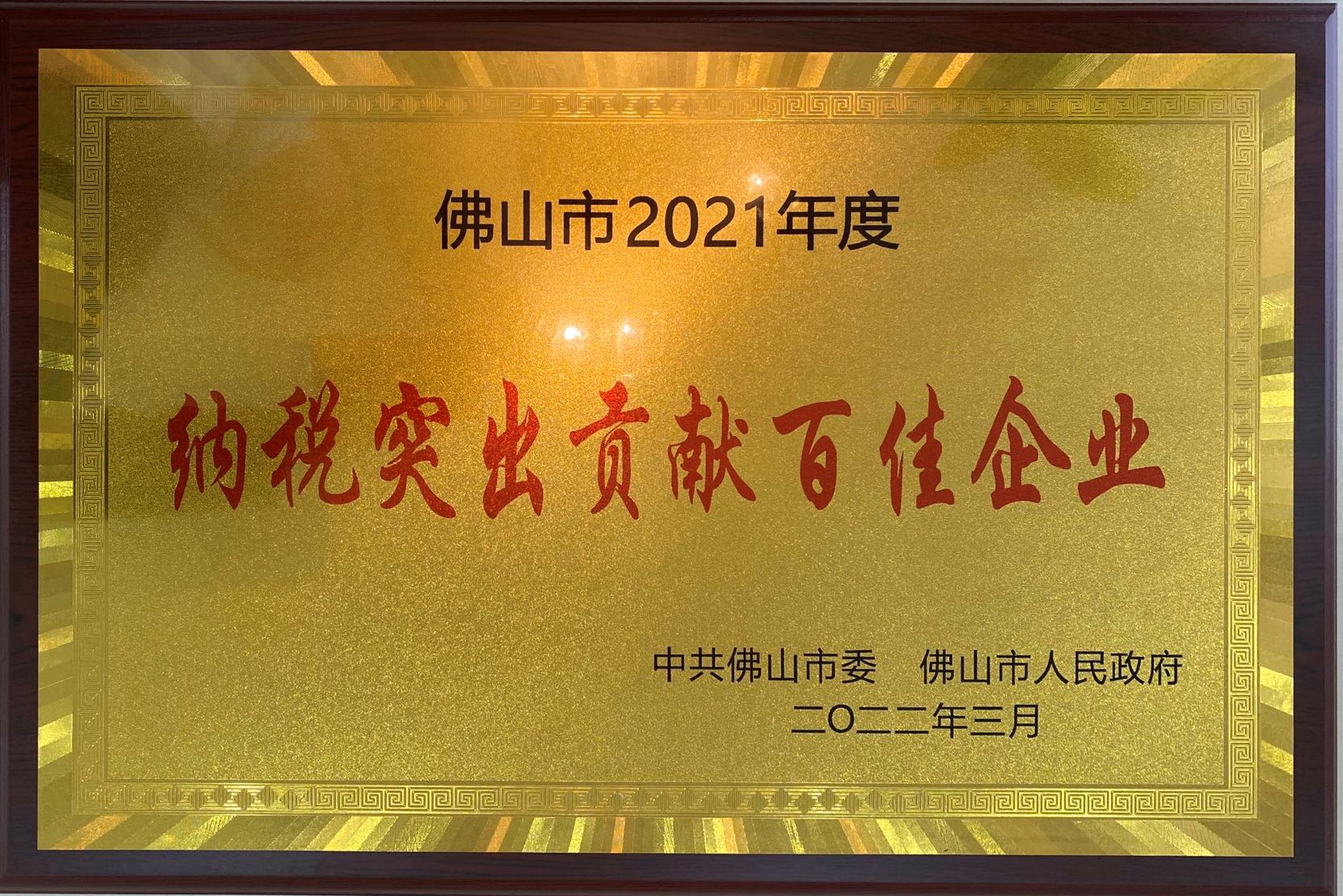 2022年3月 获得2021年度佛山市“纳税突出贡献百佳企业”称号