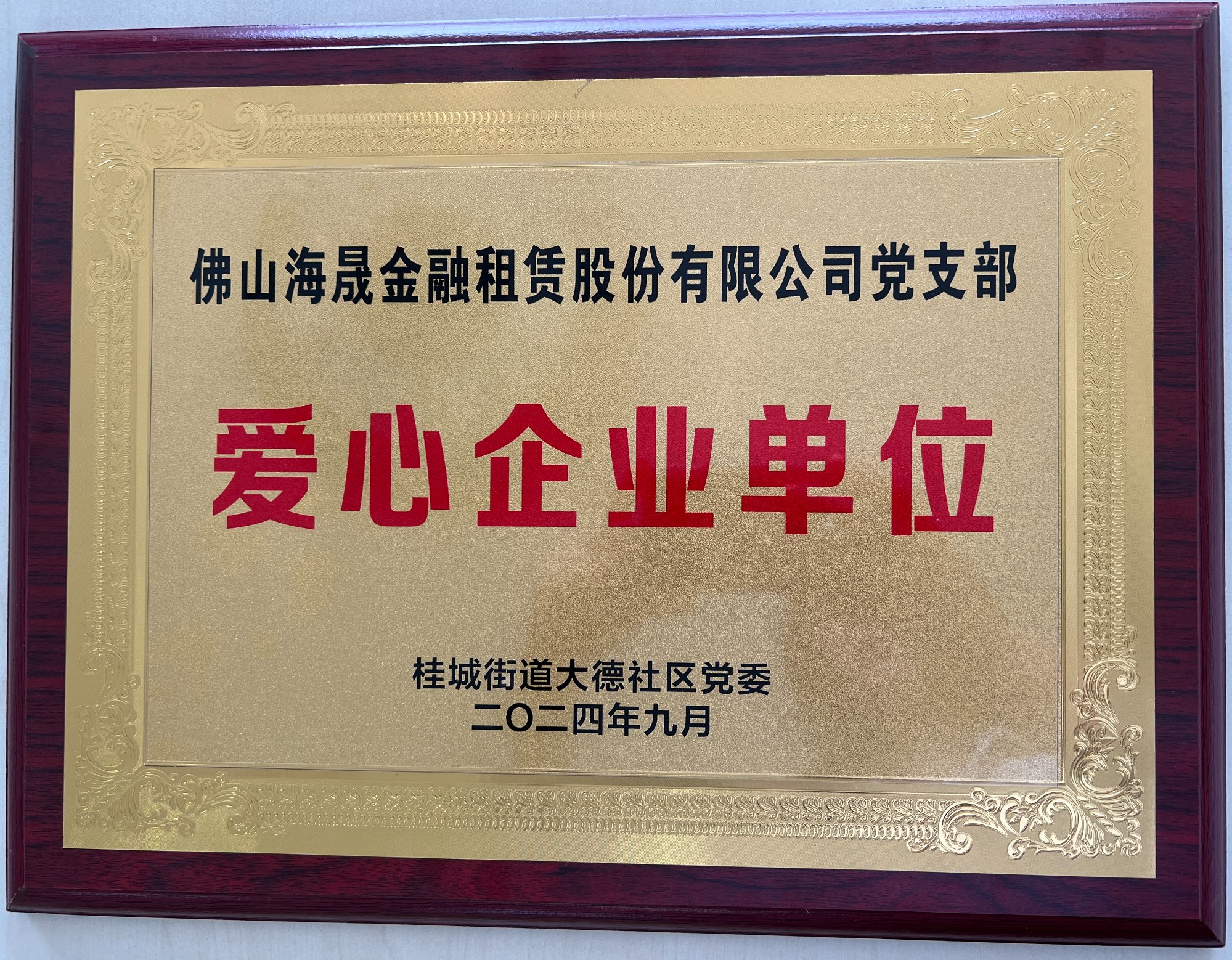 2024年9月 被桂城街道大德社区党委评为“爱心企业单位”