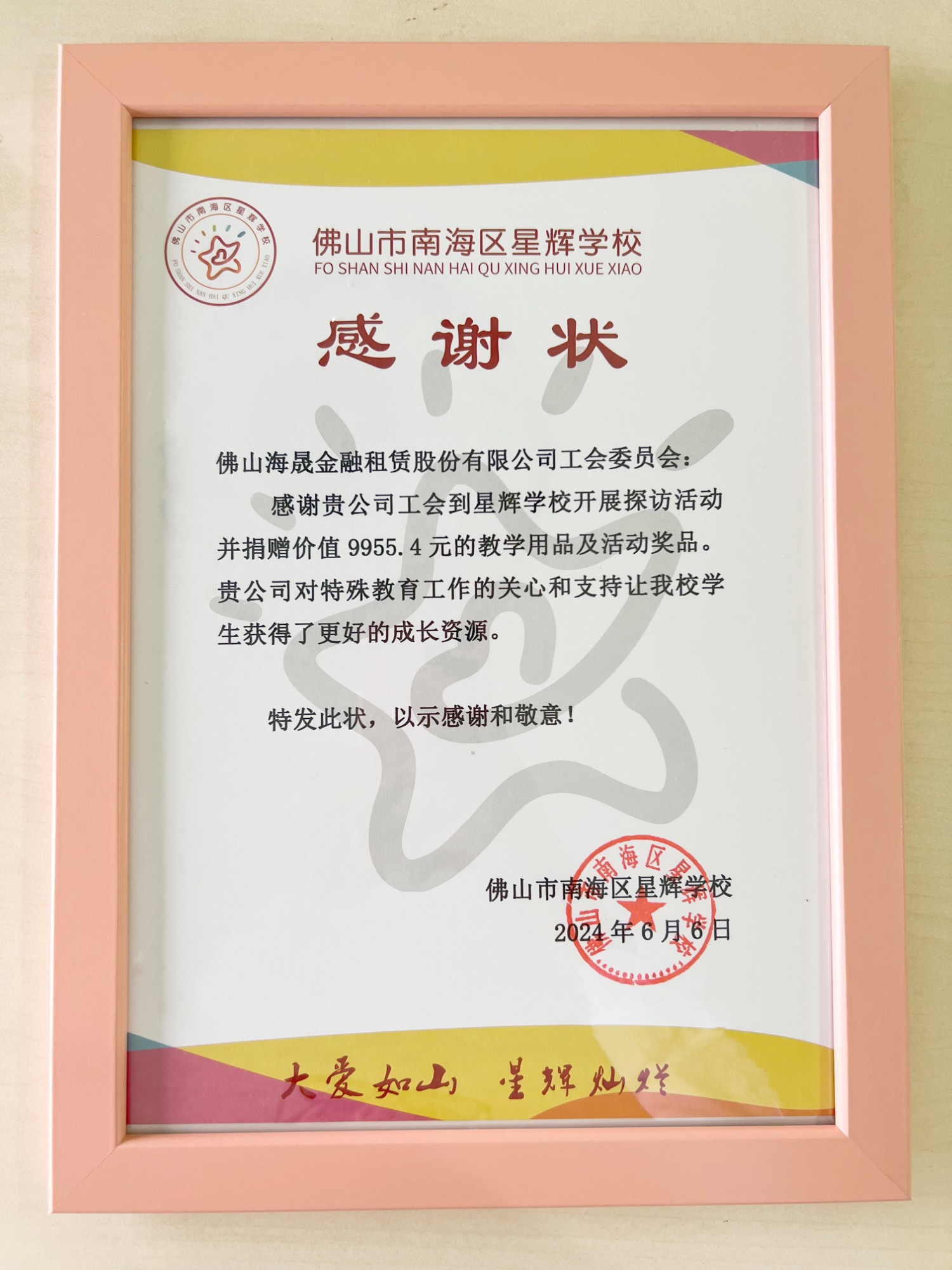 2024年6月 获得佛山市南海区星辉学校感谢状