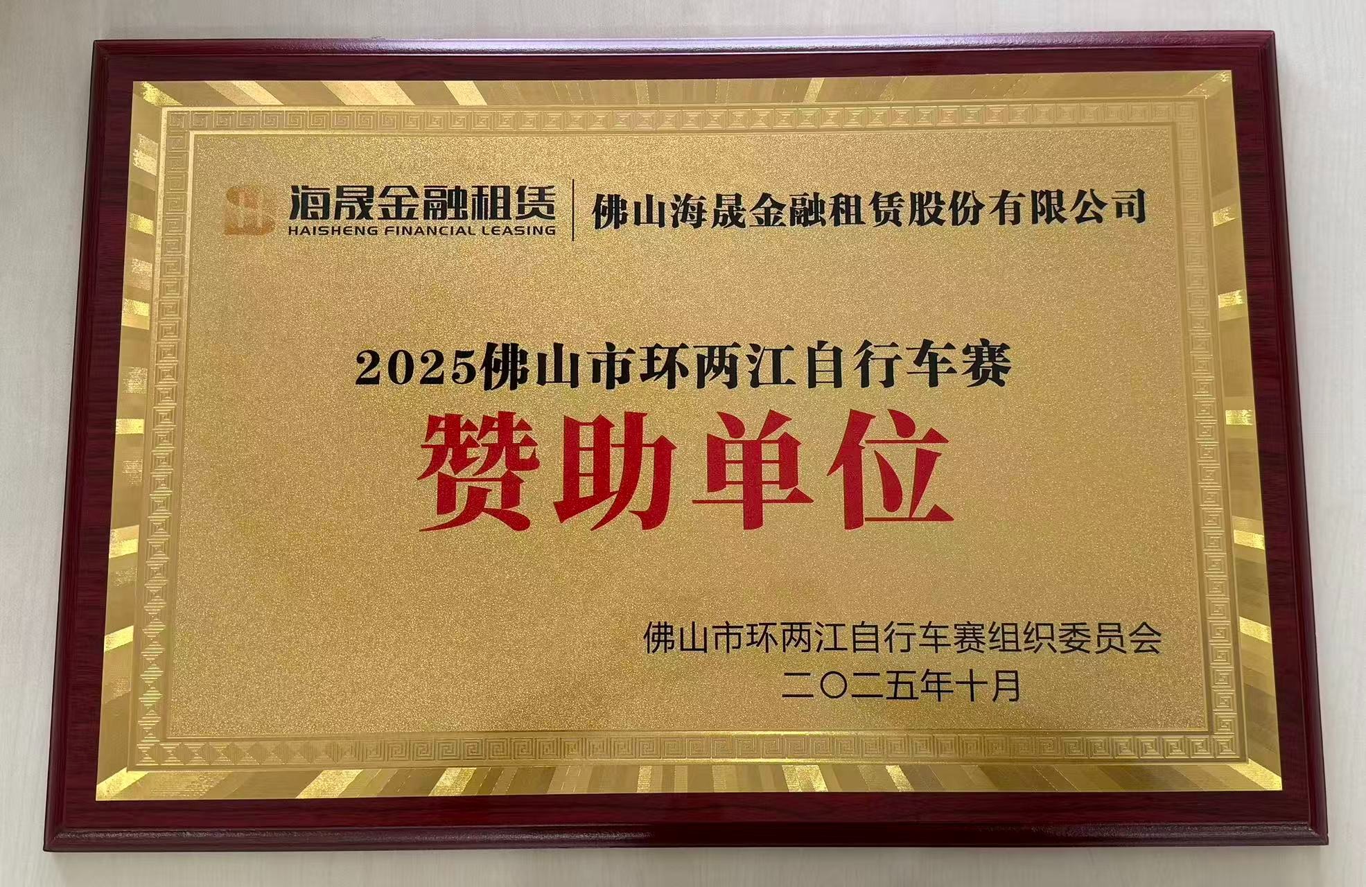 2025年10月,获得佛山市环两江自行车赛组织委员会颁发的2025佛山市环两江自行车赛赞助单位